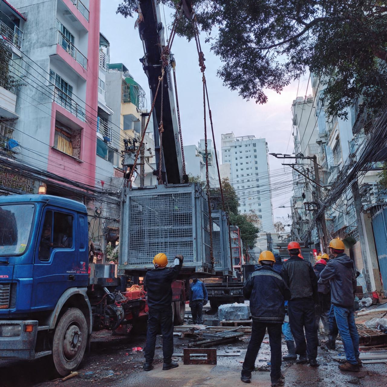 🖼️ Hình 2: Xe nâng dầu nâng kiện hàng nặng tại công trình xây dựng ở Quận 9, TPHCM.