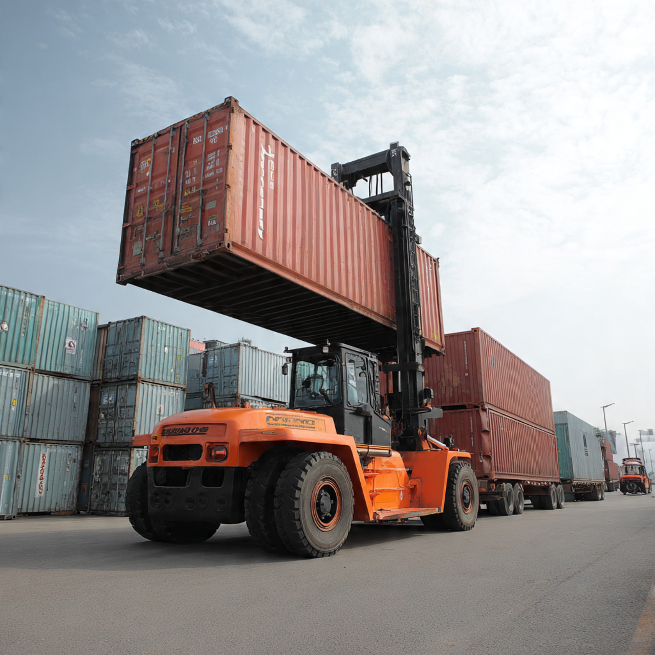🖼️ Hình 4: Xe nâng container tại cảng Cát Lái – TPHCM đang bốc xếp container 40 feet.