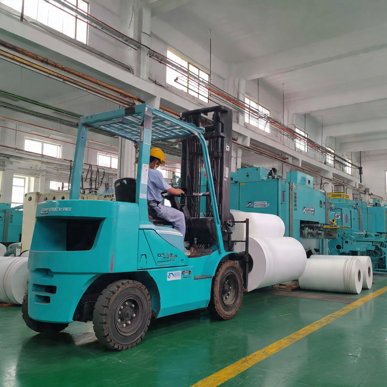 🖼️ Hình 5: Xe nâng đa năng kẹp cuộn giấy trong nhà máy in ấn tại KCN Vĩnh Lộc.