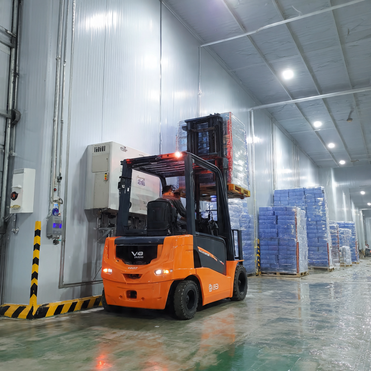 Hình 2: Xe nâng 3 tấn đang bốc xếp hàng trong kho lạnh – hoạt động ổn định và an toàn.