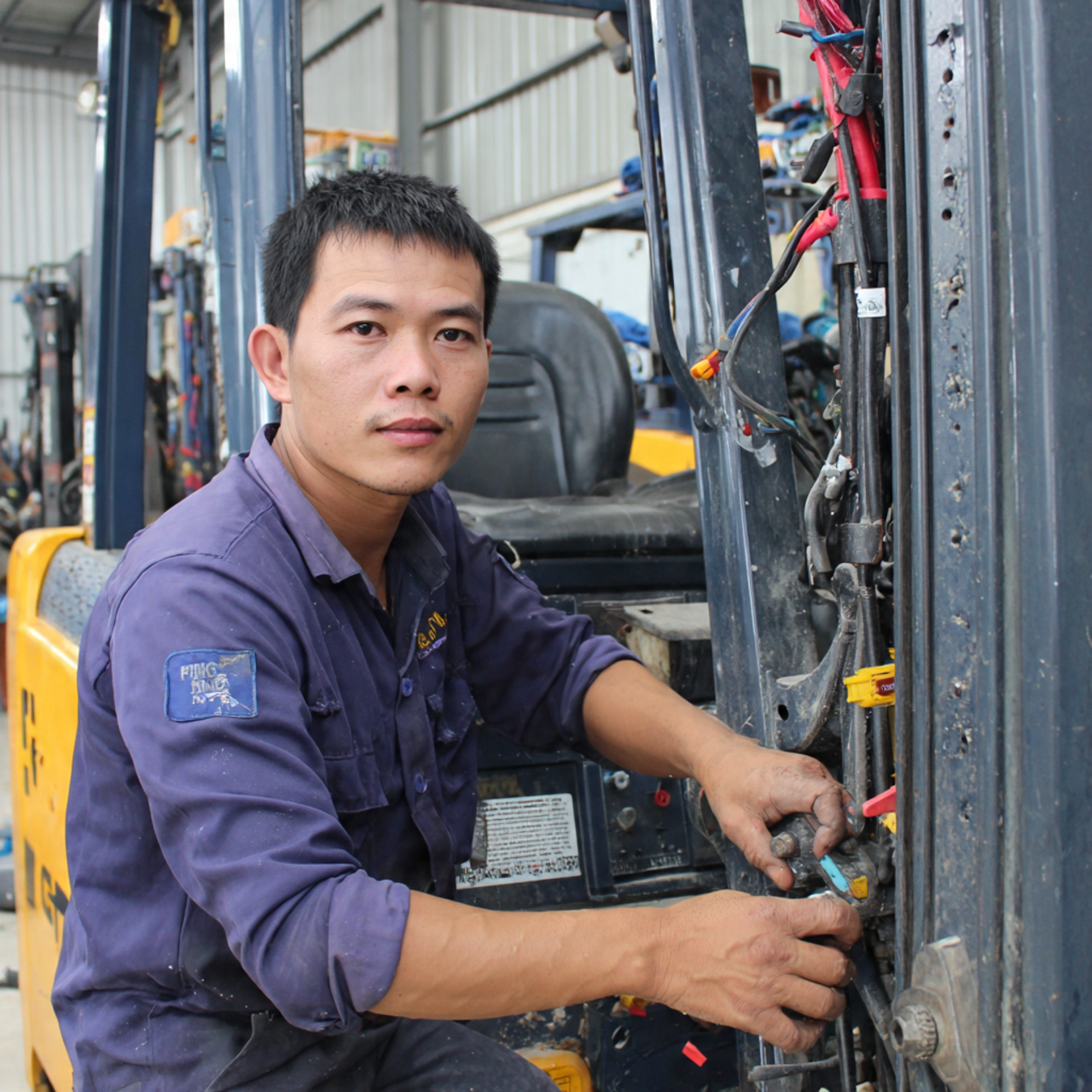 Hình 5: Kỹ thuật viên Xe Nâng Nguyễn Tuấn đang bảo trì xe tại xưởng – đảm bảo chất lượng vận hành trước khi giao khách.