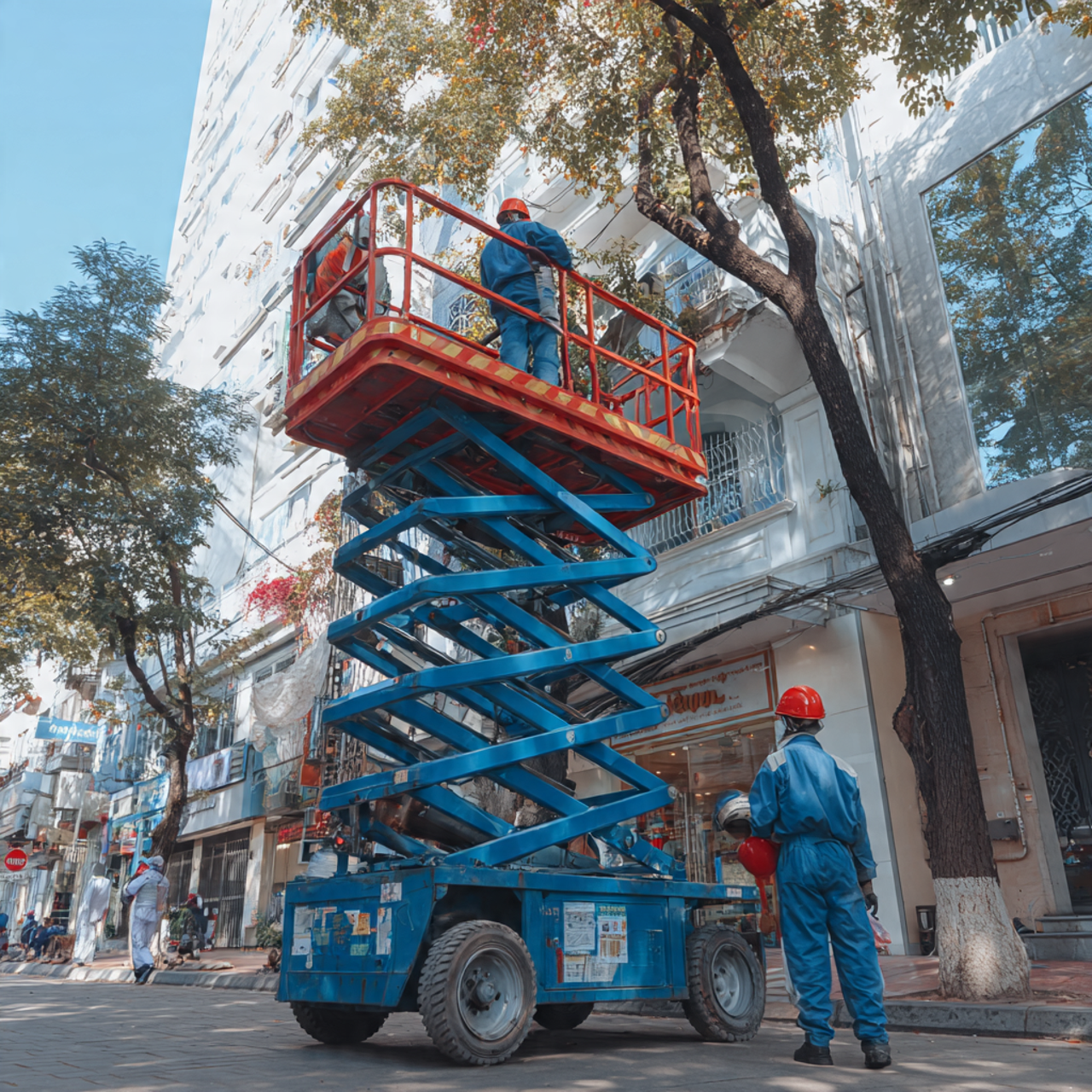 🖼️ Hình 5: Xe nâng người phục vụ bảo trì tòa nhà cao tầng tại Quận 1 – TPHCM