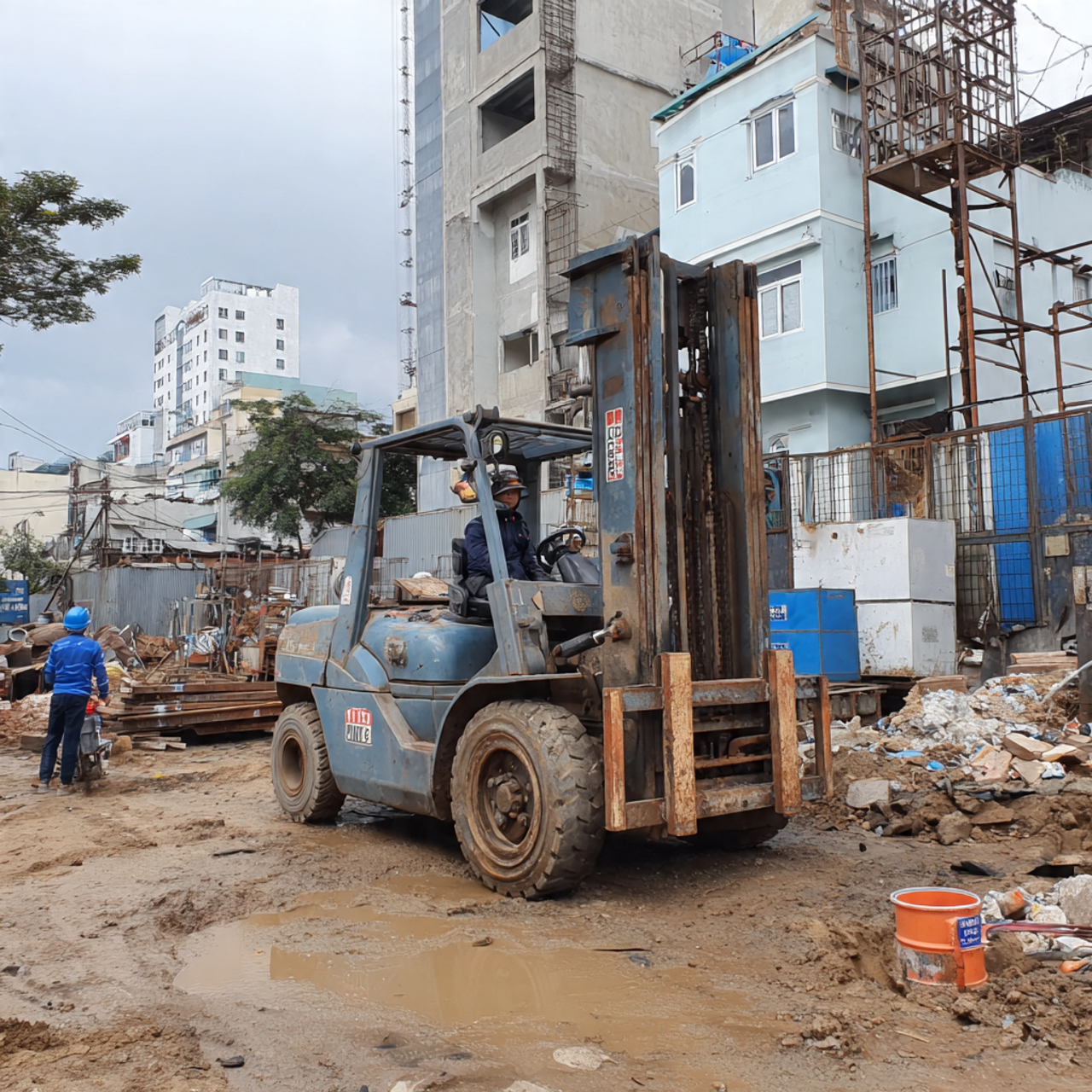 🖼️ Hình 2: Xe nâng dầu nâng kiện hàng nặng tại công trường xây dựng ở Quận 7, TPHCM.